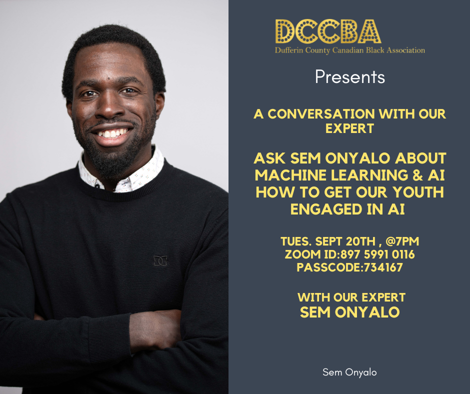 Join us on Tuesday September 20th at 7PM as our Expert Sem Onyalo walk us through Machine Learning & AI and how we can get more youth interested in AI. This session is free and open to everyone. Parents, Educators and students are welcome to join....